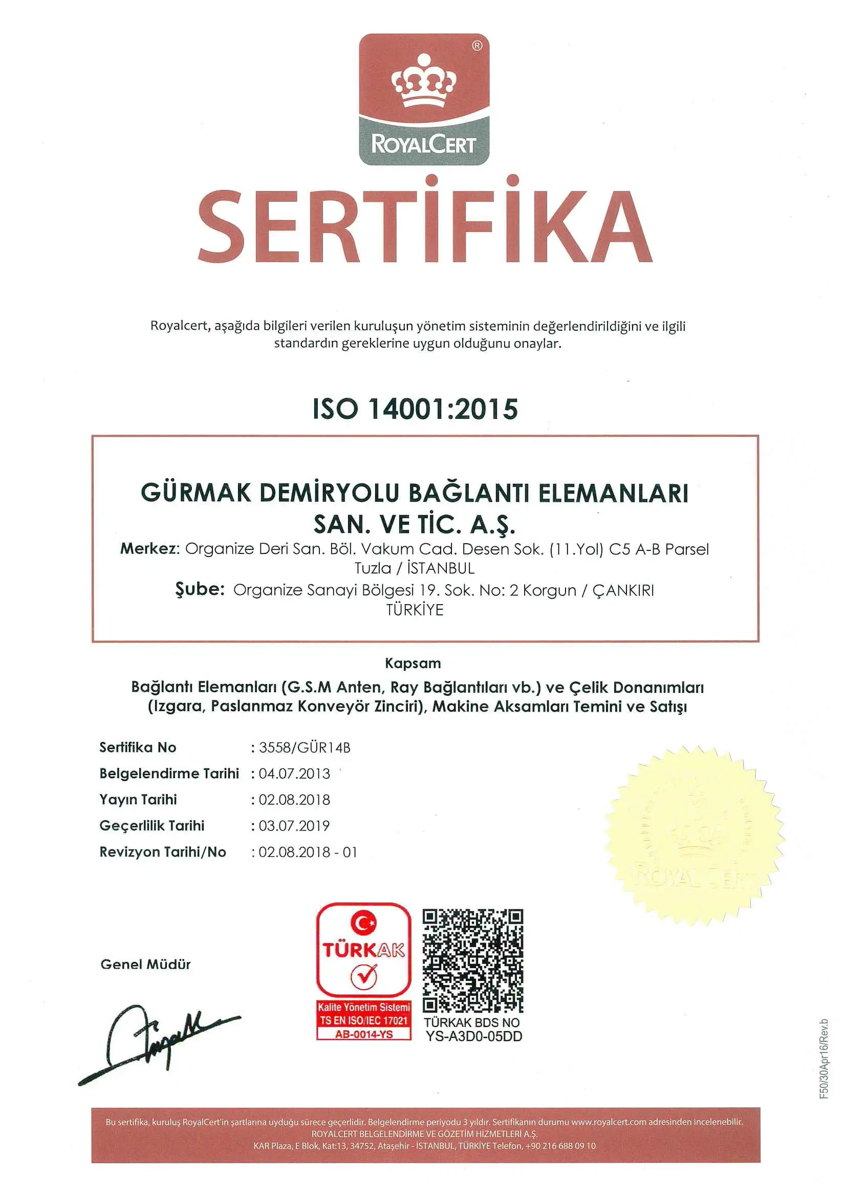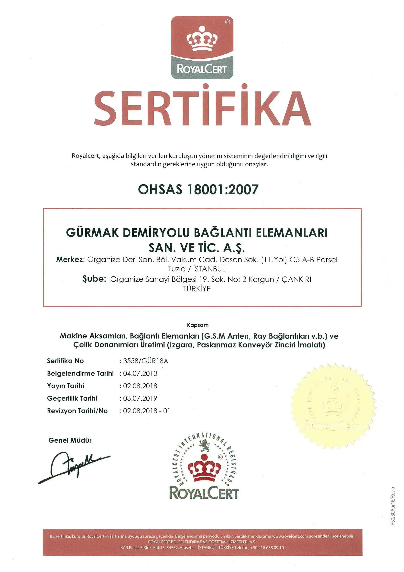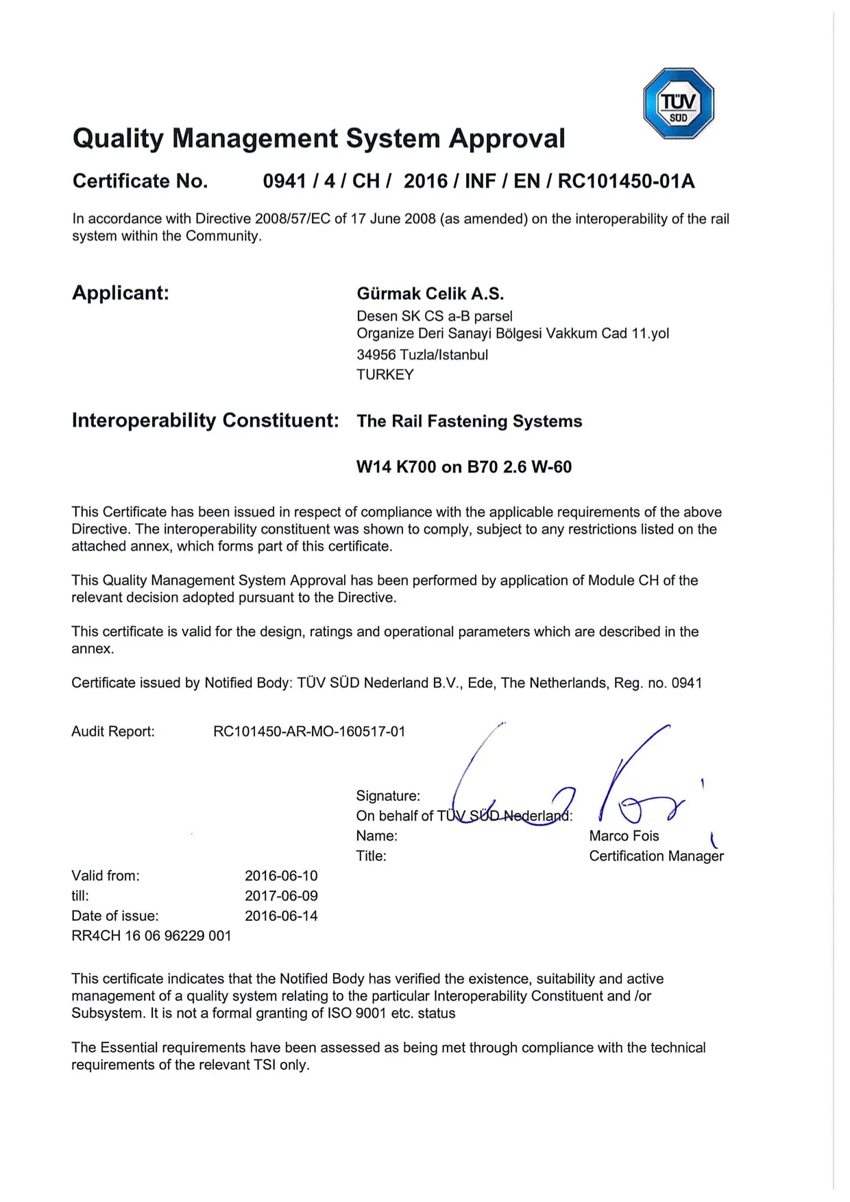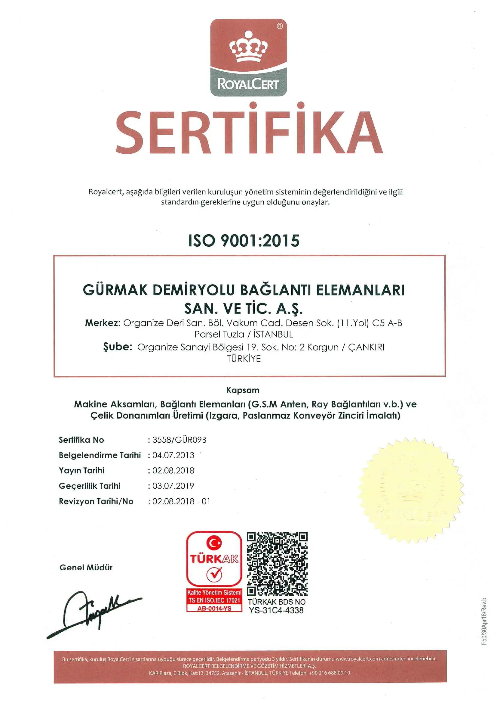Gürmak Demiryolu, düzenli denetimler neticesinde çeşitli kuruluşlardan edindiği sertifikalarla kalite yönetim sistemini en iyi seviyede tutmaktadır.
