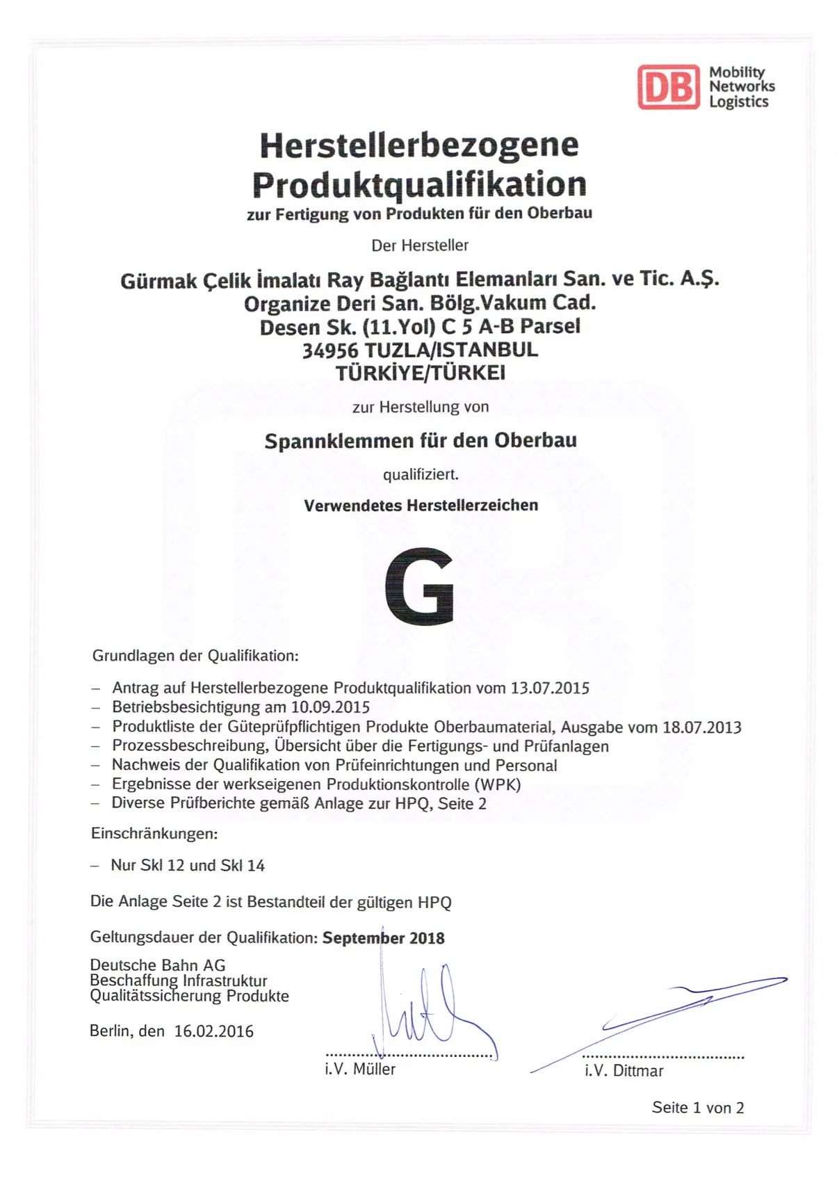 Alman Demiryollarının tedarikçi belgesi olan HPQ sertifikası 2016 yılından beri devam etmektedir. Belirli aralıklarla yapılan denetimler Gürmak Demiryolu kalite yönetimi ve üretim kalitesini açıkca göstermektedir.